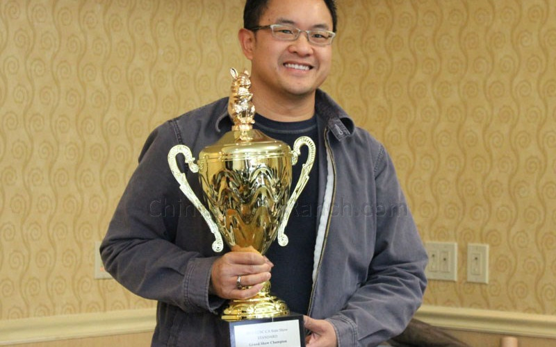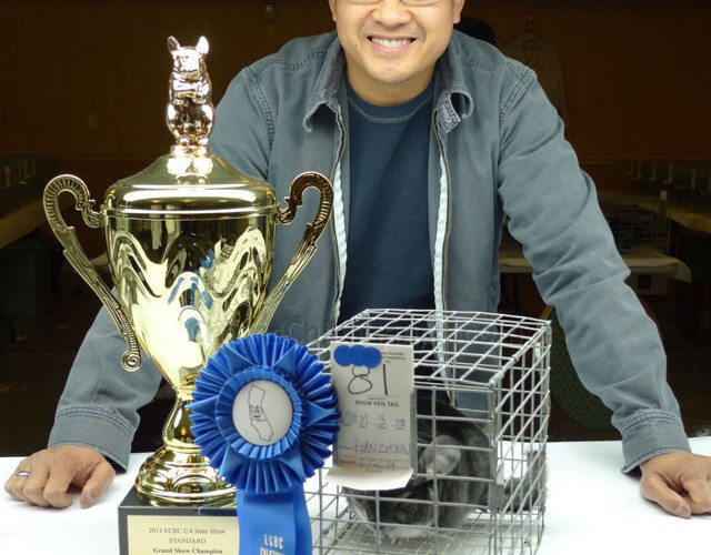 The next morning, our owner only had one standard to show, Earle Grey (the chinchilla he decided to bring last minute). So, he didn’t get to the show hall until 8am after some much needed sleep. He spent over an hour grooming Earle Grey, putting him into the show cage and taking him out again three times! Eventually, he gave up and entered him into the show in the best condition he could get Earle Grey’s fur in. Earle Grey came up in the first of 10 classes. Maxine made some very nice comments about him and our owner was so proud when Earle Grey won Class Champion! Nine more classes to judge to see how he would fare on the final table against the nine other class champions. When the time came, my owner was so surprised that Earle Grey won Grand Show Champion! He was so honored when he won a huge 12-pound GSC trophy! Our owner never thought he would win that award. He then only had a few hours to get back to the airport to make his return flight. The only space for the two trophies was in his backpack. You can imagine the looks at the airport!