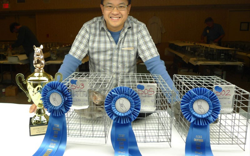 Well, this show was the first of this year’s season. Unfortunately, I didn’t get to tag along because I was just out into breeding, so my owner decided to leave me at home for this one. I got the lowdown from my next-door neighbor, E2 (he’s a homo ebony). My owner brought Snuggles and his sister Amber (beiges), Whisper (violet), Sebastian (white v/c) and the last minute entry Earle Grey (standard). The show was in Sacramento, CA. My owner flew the chins down on Friday. It was the first time he flew with chins. E2 said the cargo hold for pets was small and cold, but Alaska Airlines handled them well and thought they were really fascinating. Anyhow, they got there in the afternoon, and they rented a car and made it to the hotel where the show was being held. They were transferred to the show cages and given pellets, water and hay. They were there with over a hundred other chins (E2 is a chinchilla, not known for their counting abilities). He said that evening was interesting with all those other chins in the show hall.